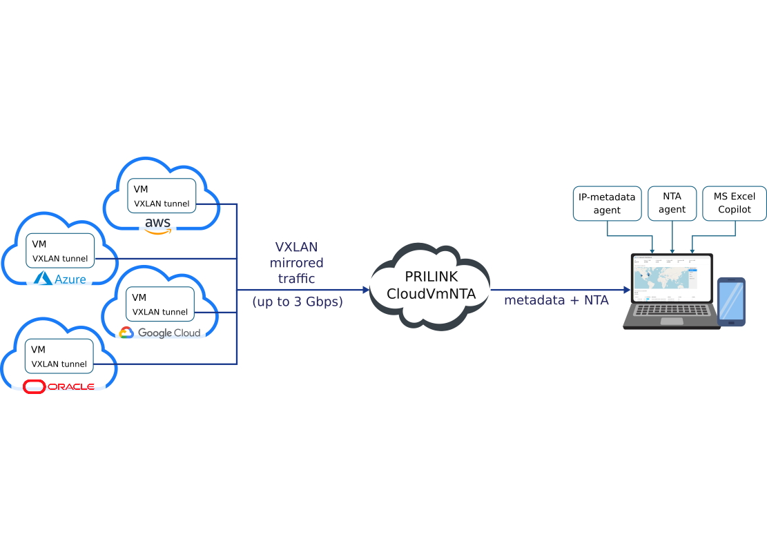 cloud-VMNTA runs on cloud servers provisioned and managed by Prilink. It can analyze network packets from any source VM through a VXLAN tunnel. cloud-VMNTA is designed for monitoring heavy cloud traffic from multiple VMs in different regions around the world (e.g. traffic from AWS EC2 instances, or from other cloud providers such as Google Cloud, Microsoft Azure, and Oracle). Bandwidth capacity is 3.0 Gbps baseline (25.0 Gbps burst).